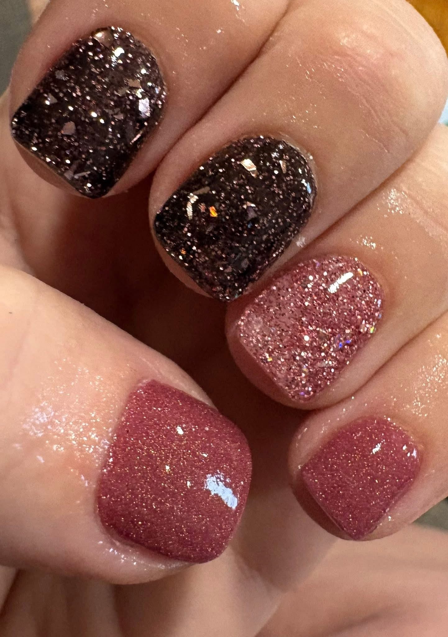 This is a delicate flake dip which is very user friendly. Topping with clear dip is strongly recommended. These swatches show 2 dips.