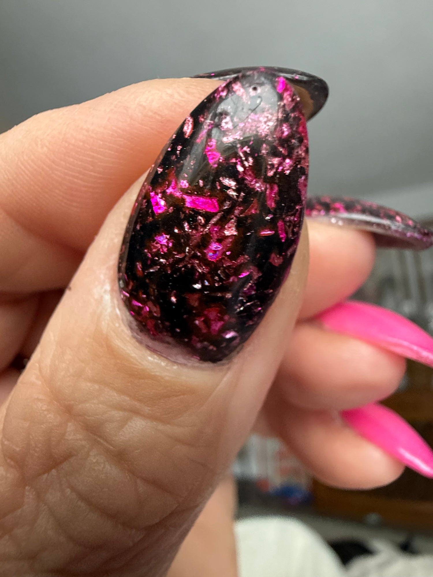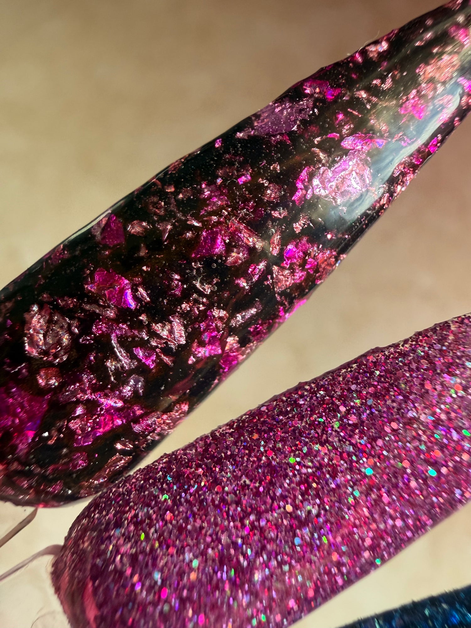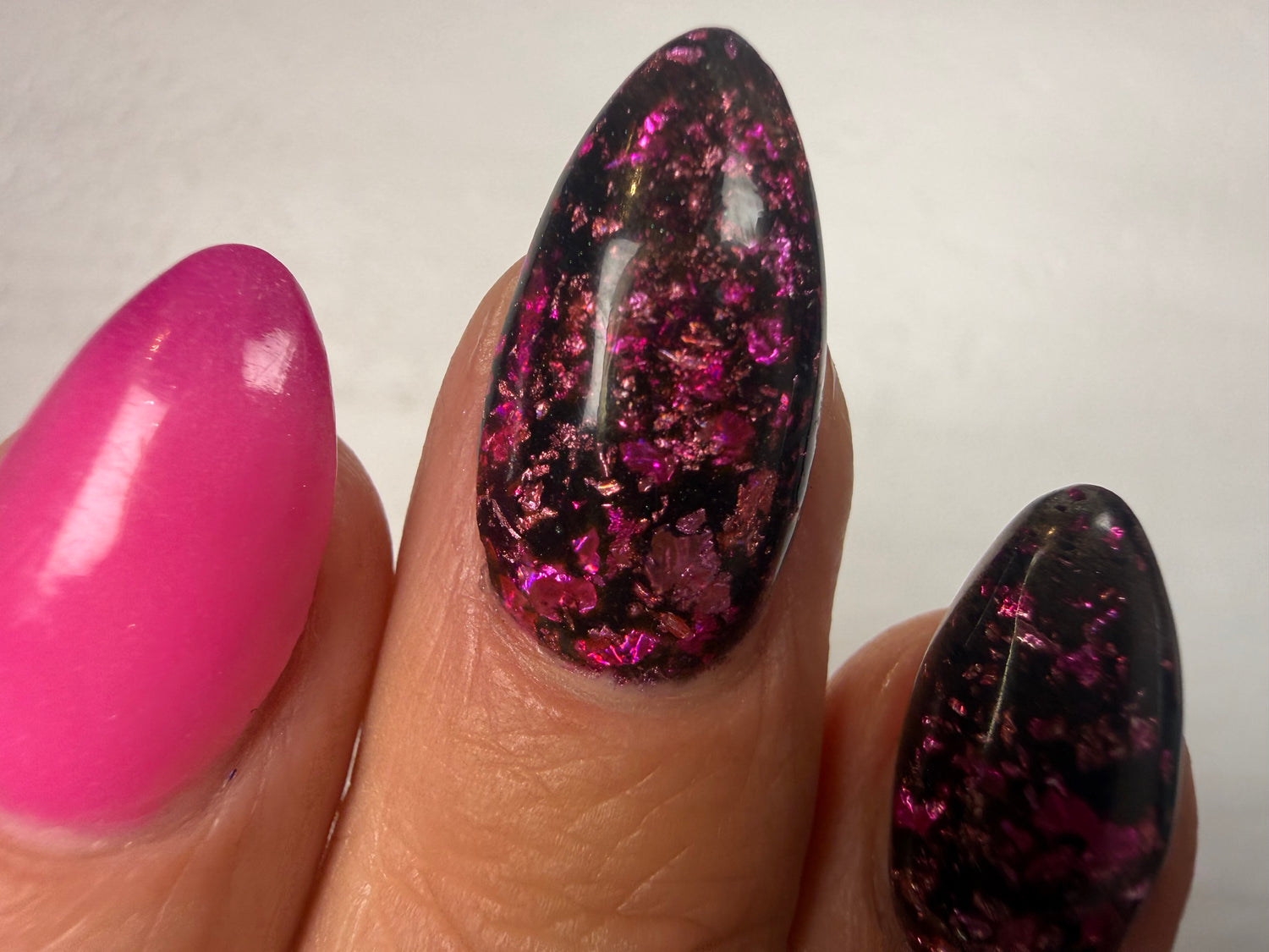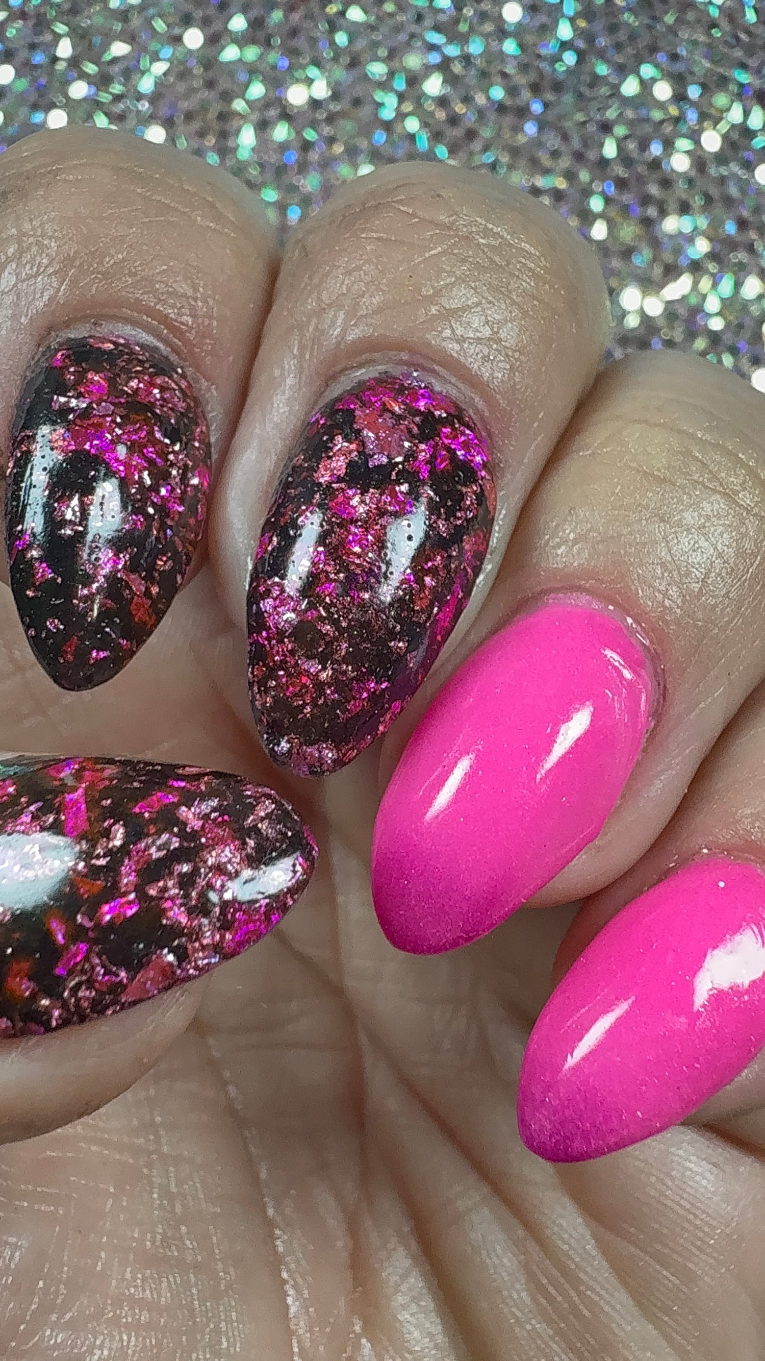 This is a delicate flake dip which is very user friendly. Topping with clear dip is strongly recommended. These swatches show 2 dips.