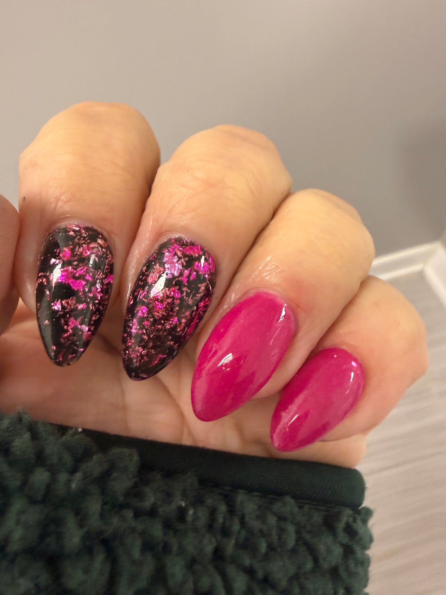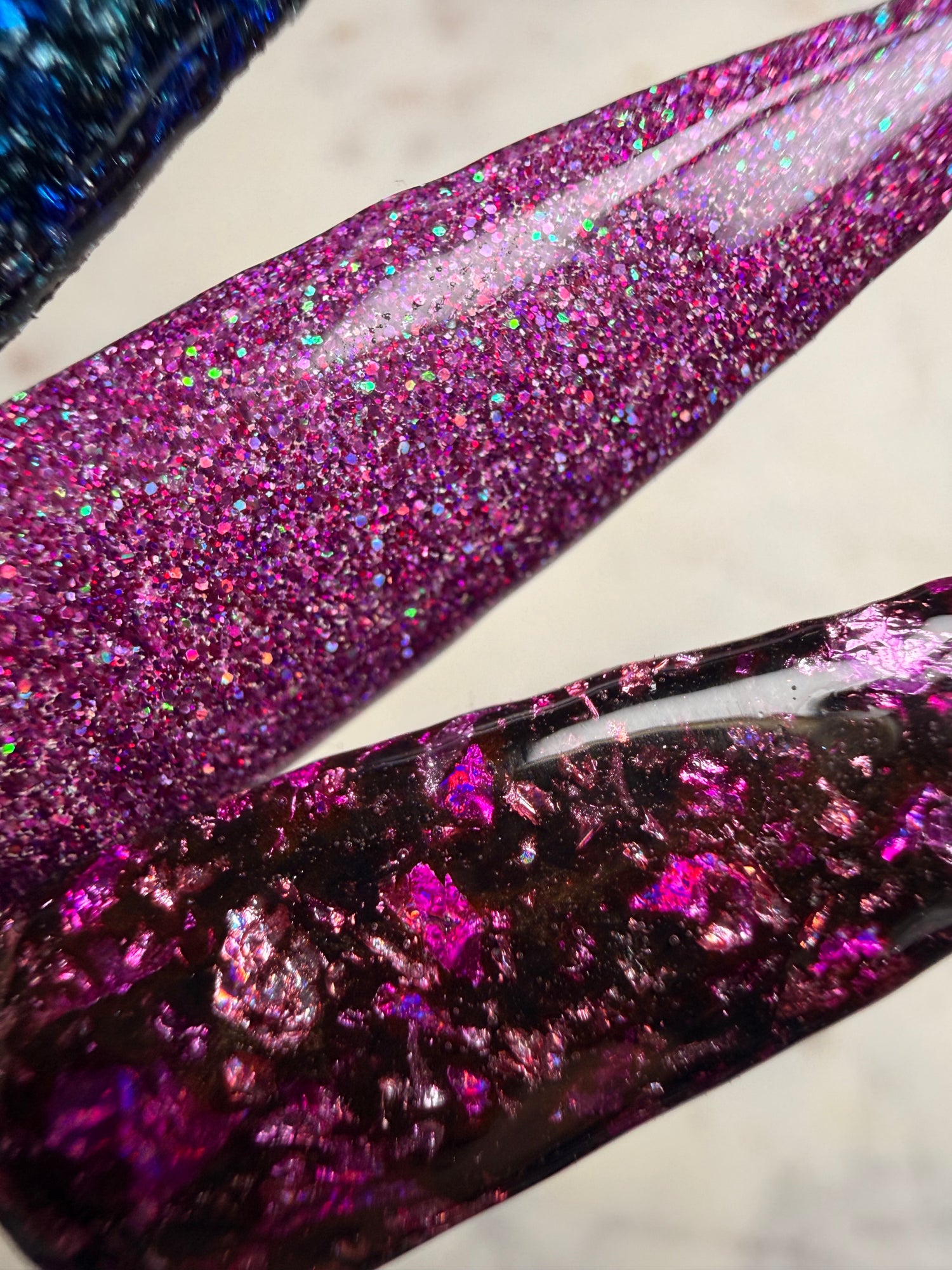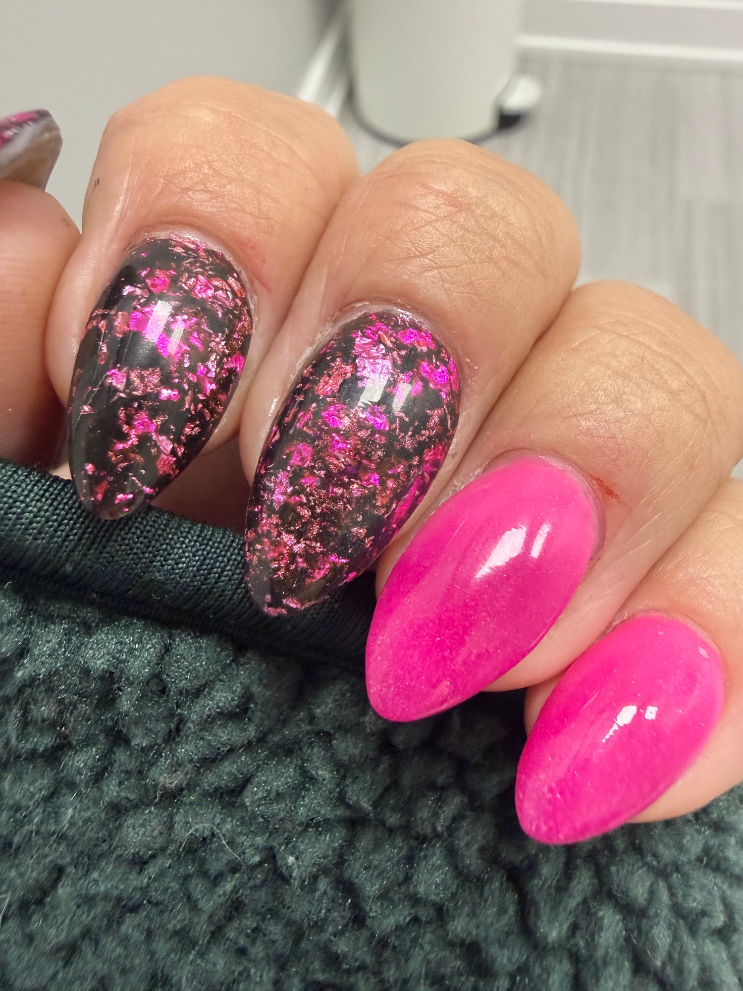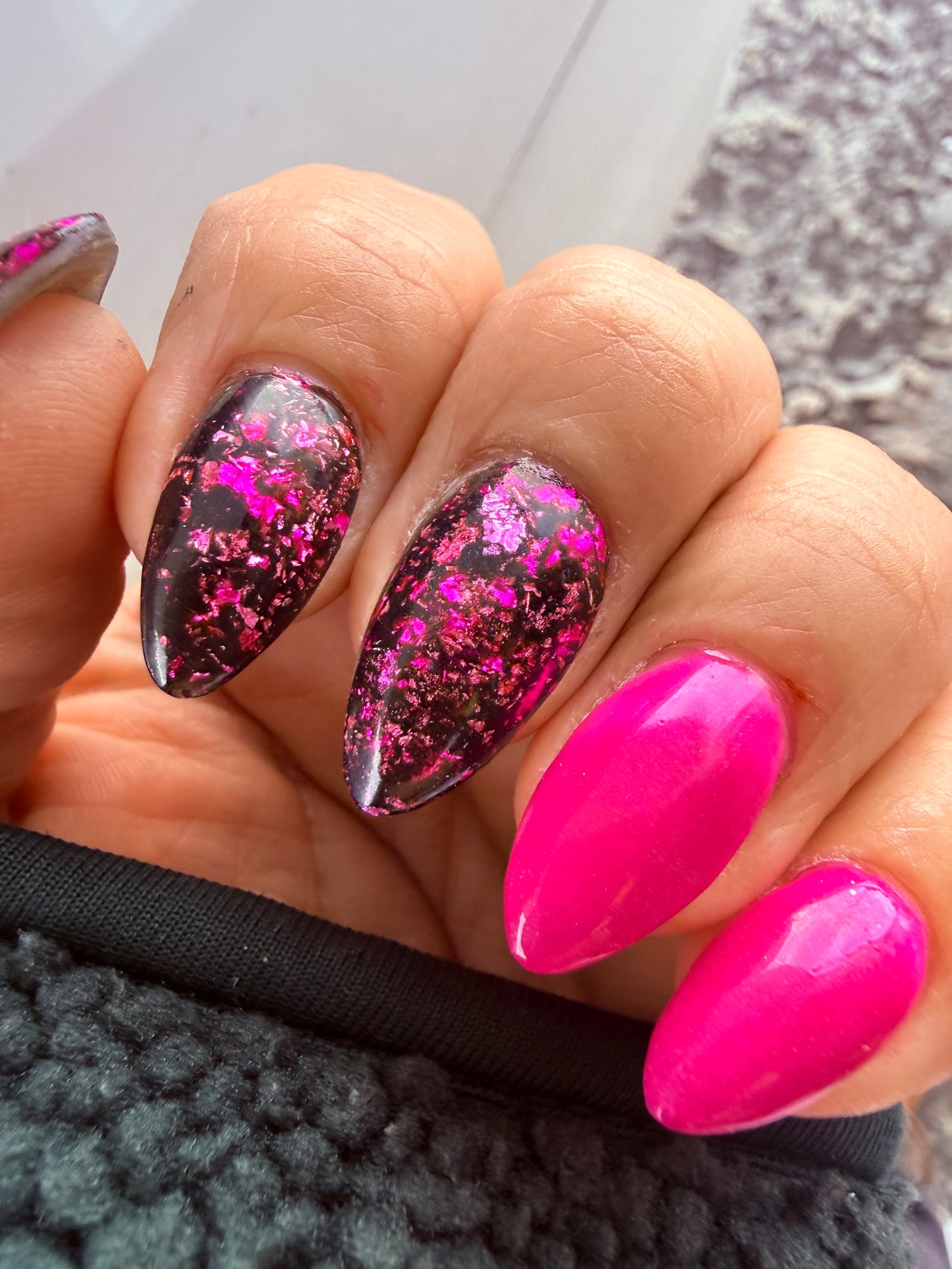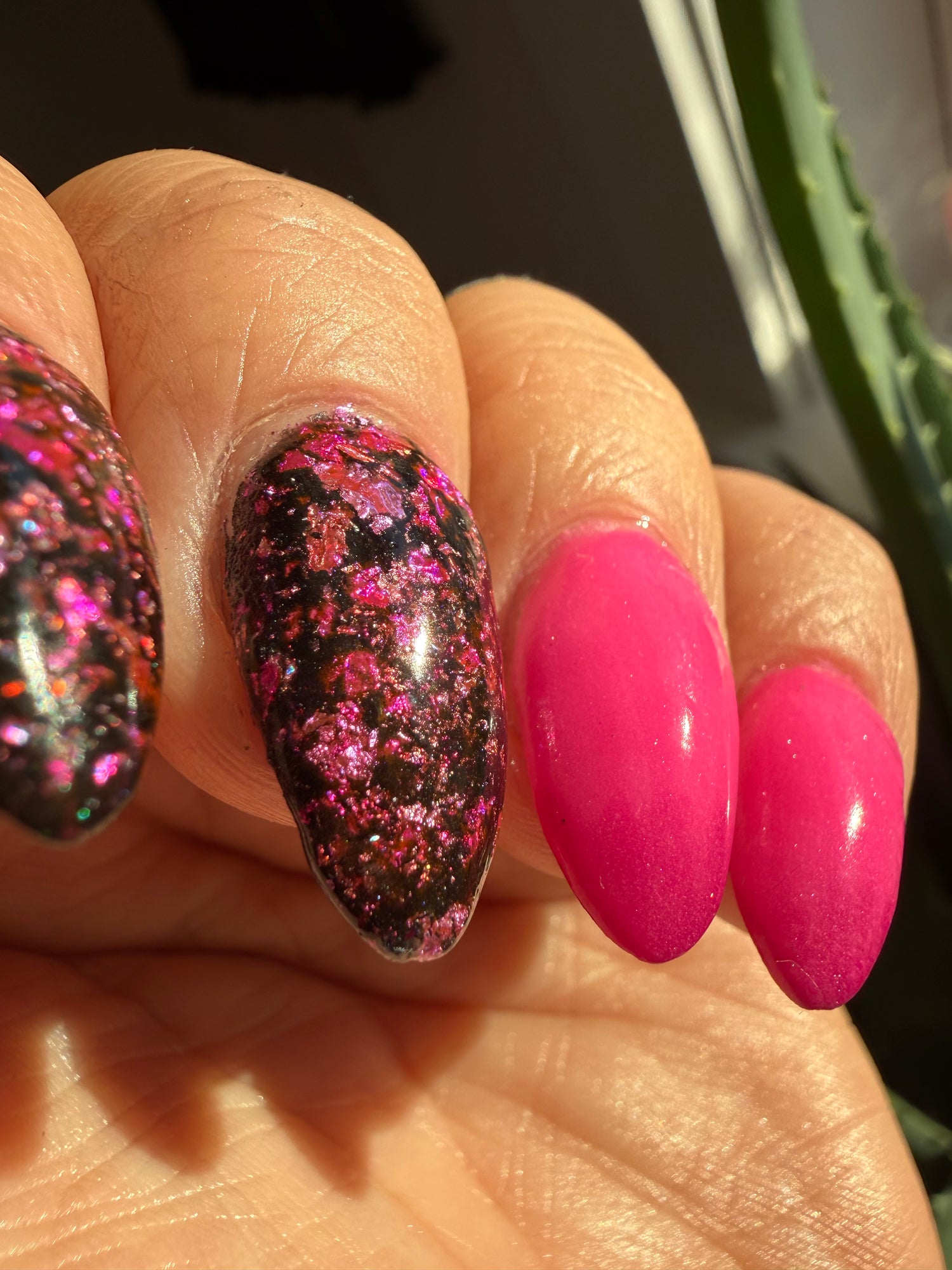 This is a delicate flake dip which is very user friendly. Topping with clear dip is strongly recommended. These swatches show 2 dips.