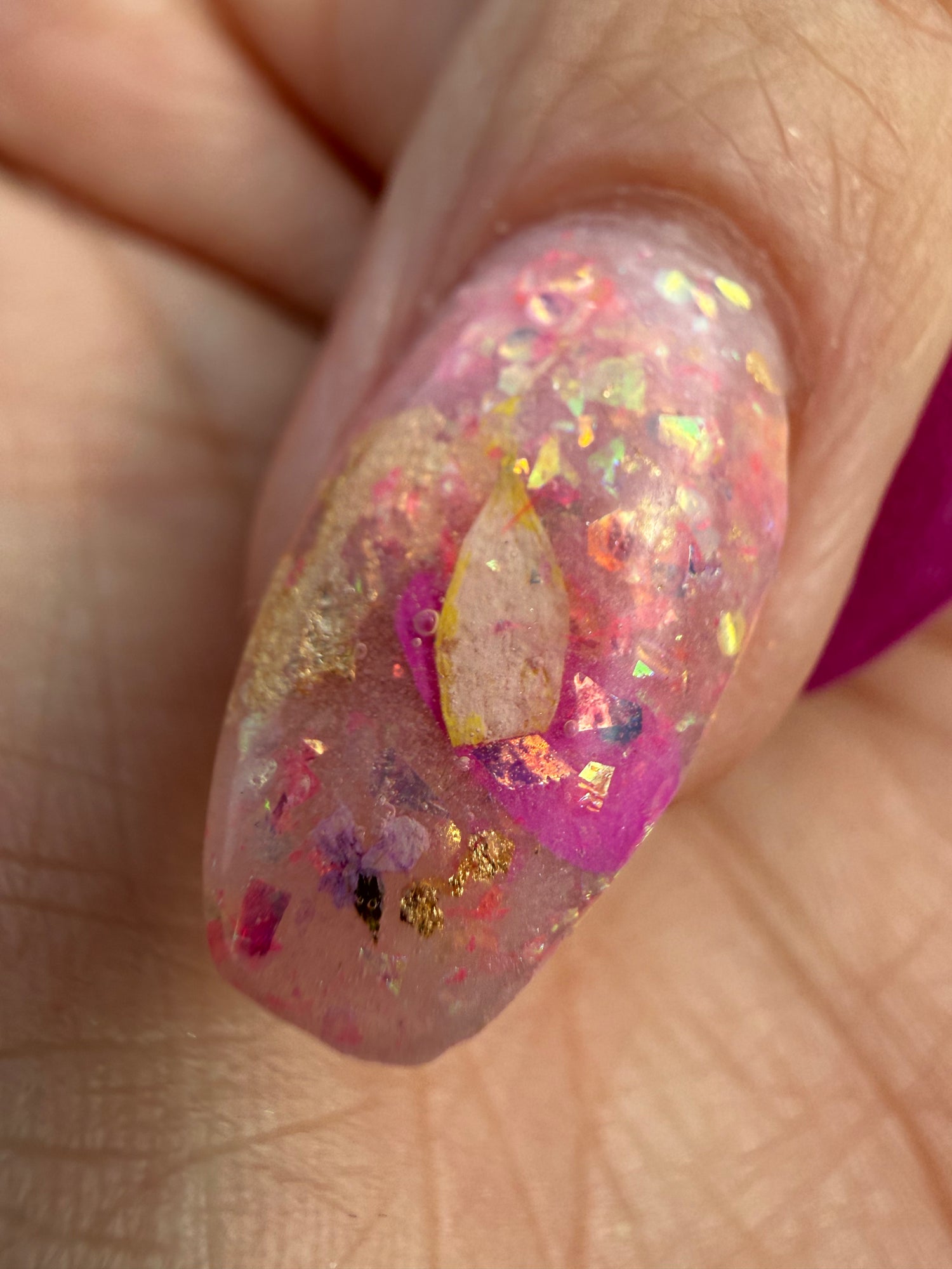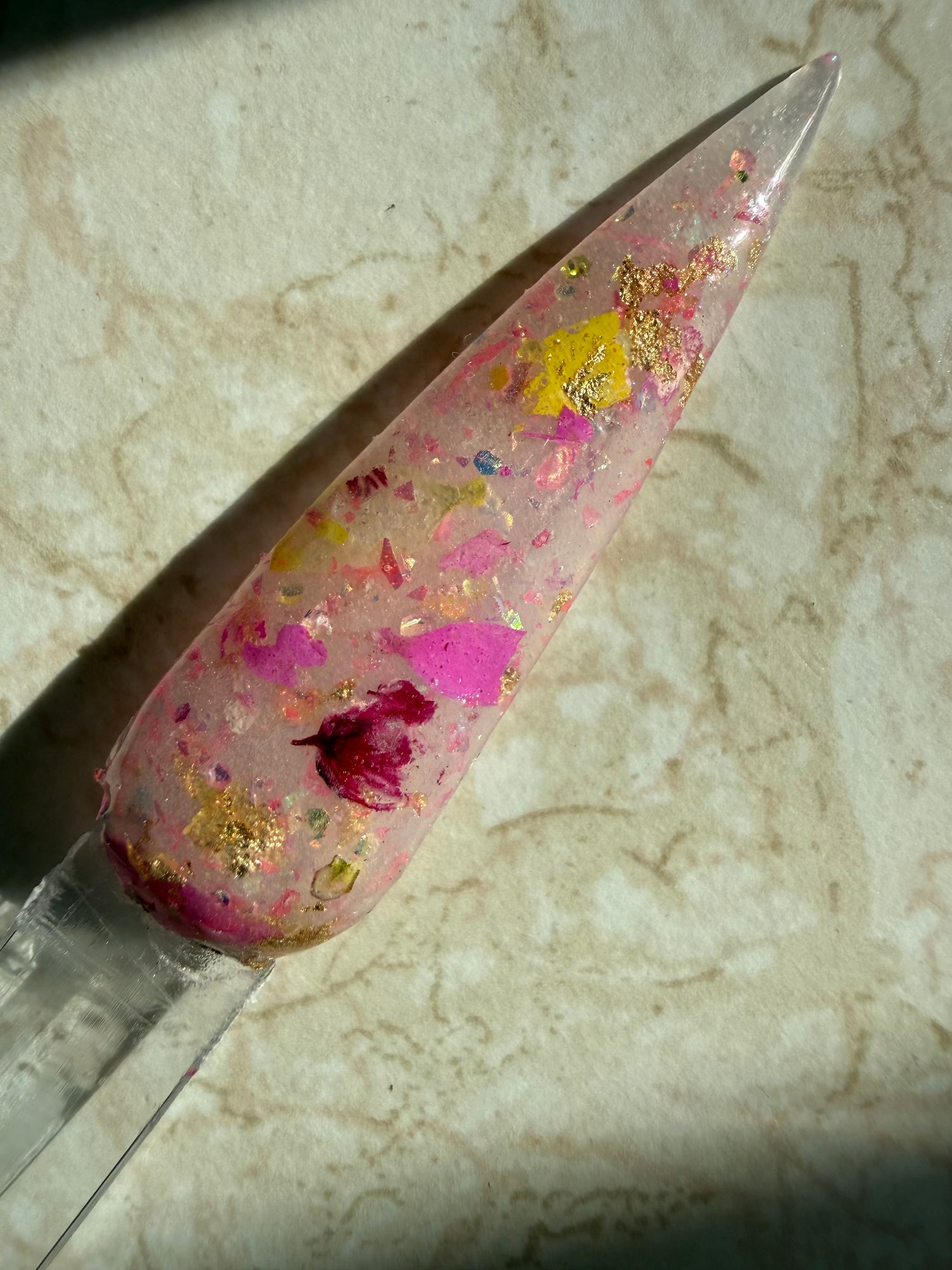 This is a floral flake dip and needs a good pat/press down after dipping. Activating after each dip and pressing them down will help the peices stick and lay flat. Topping with clear dip is strongly recommended. These swatches show 2 dips colour and topped with 1 dip clear. Matte and Glossy finishes shown.