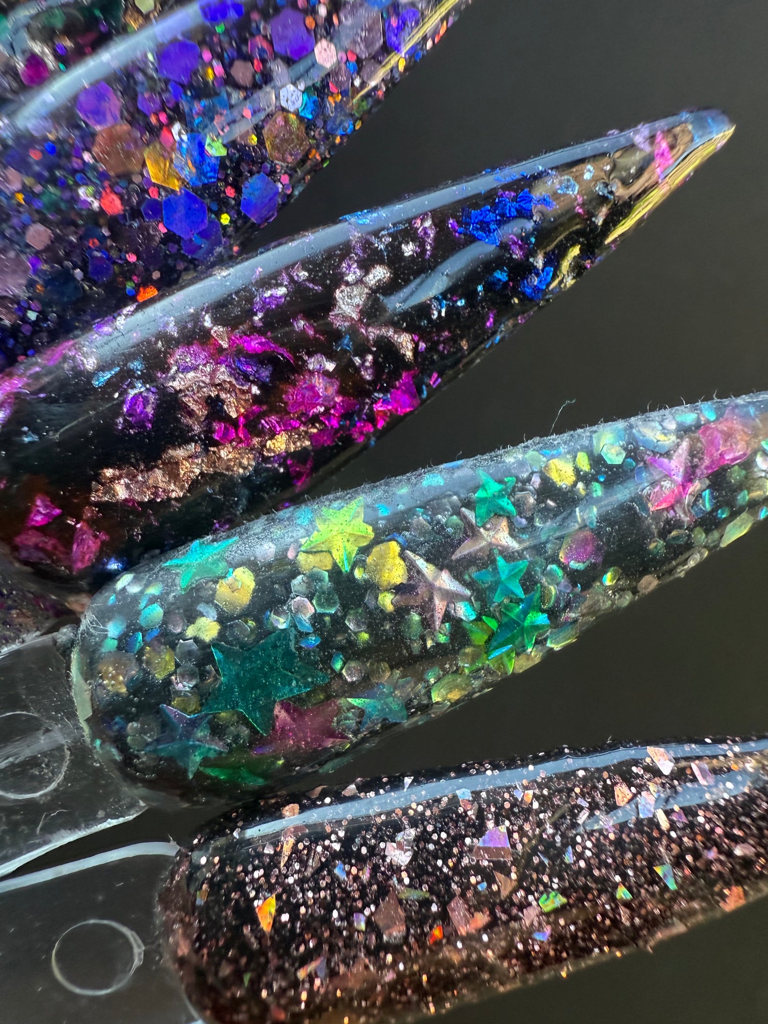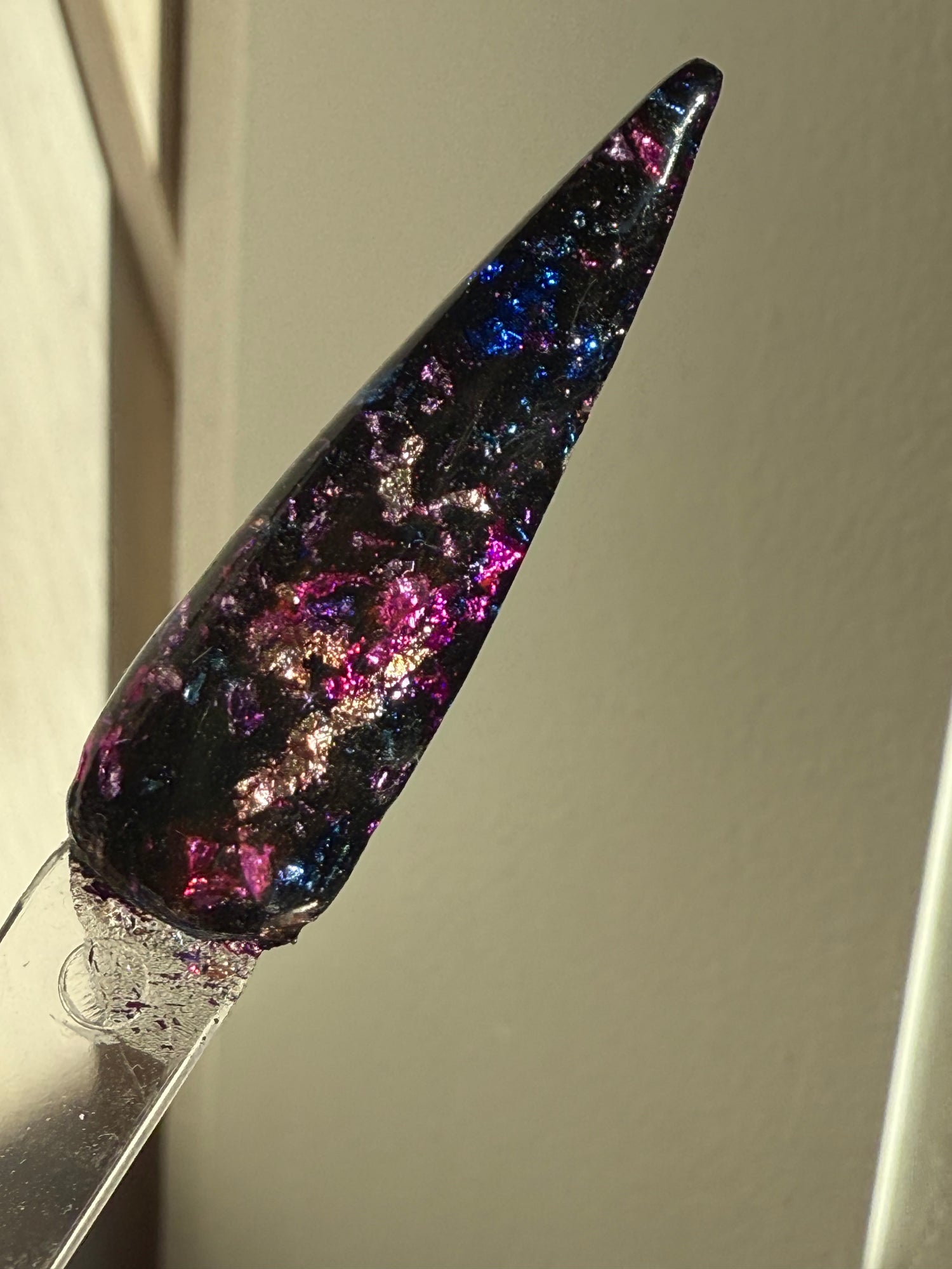 This is a delicate flake dip which is very user friendly. Topping with clear dip is strongly recommended. These swatches show 2 dips.