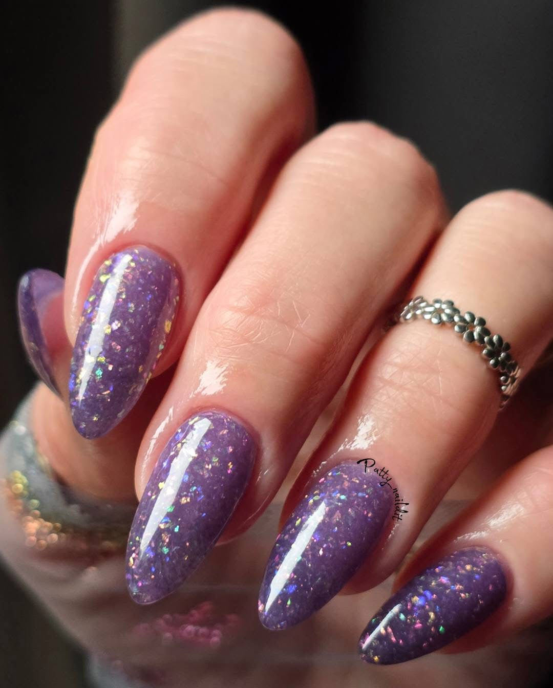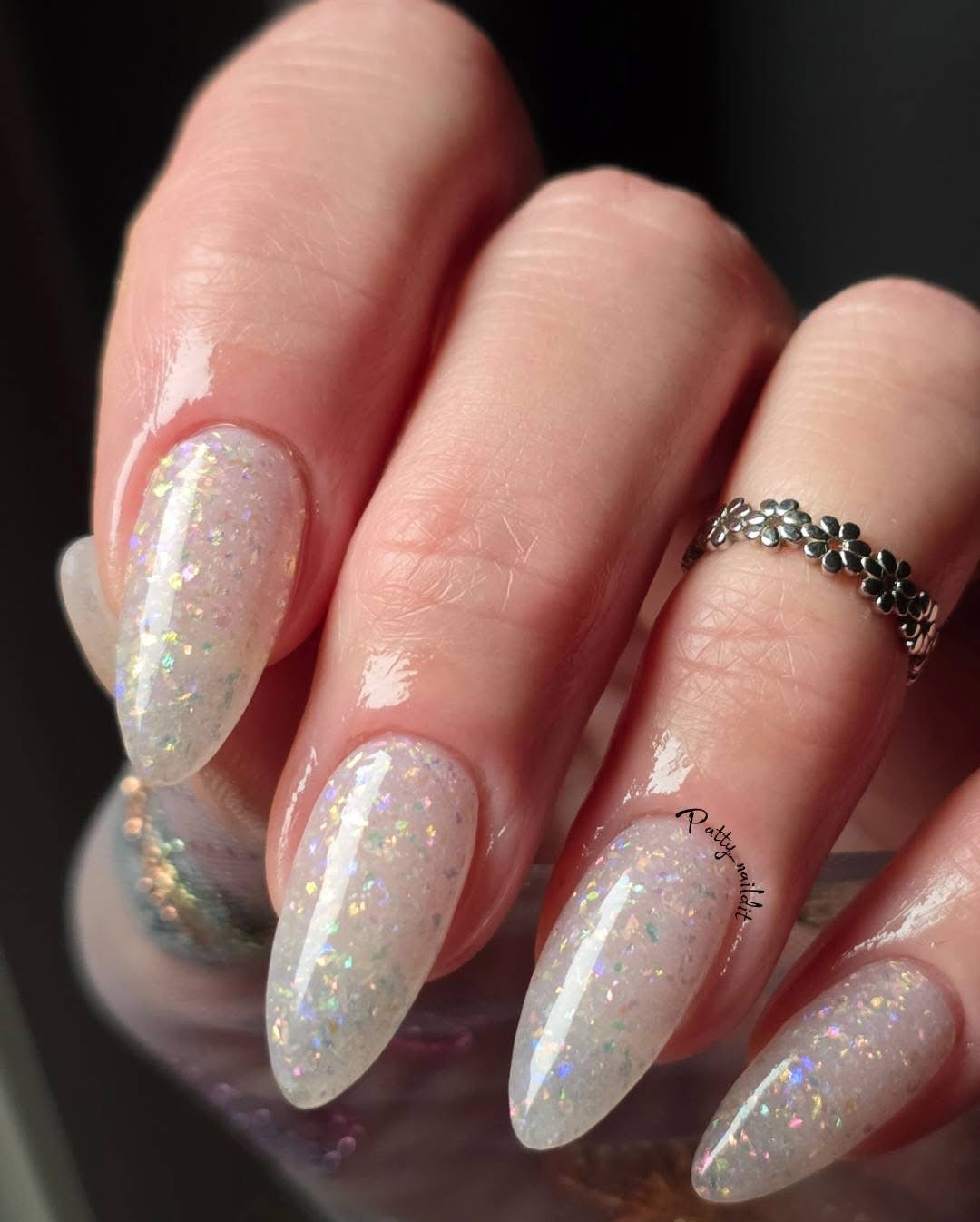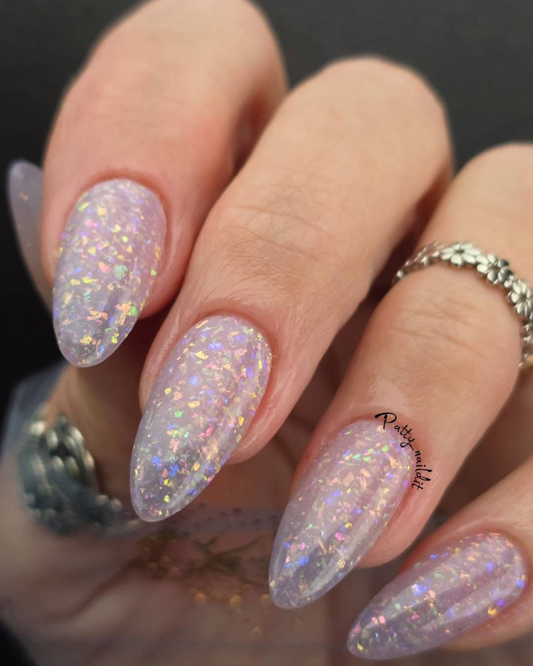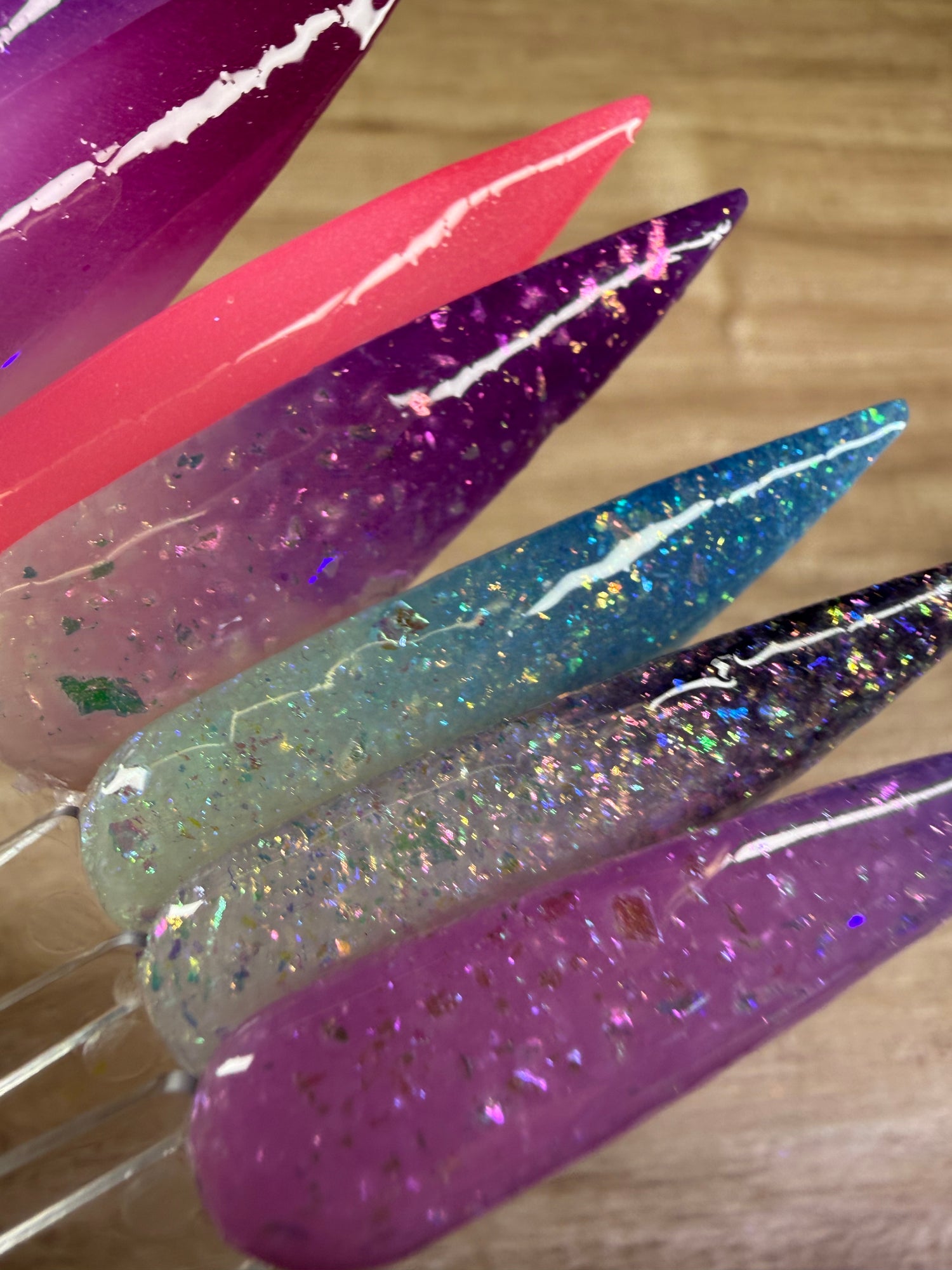 This is a delicate flake dip which is very user friendly. Topping with clear dip is strongly recommended. These swatches show 2 dips.