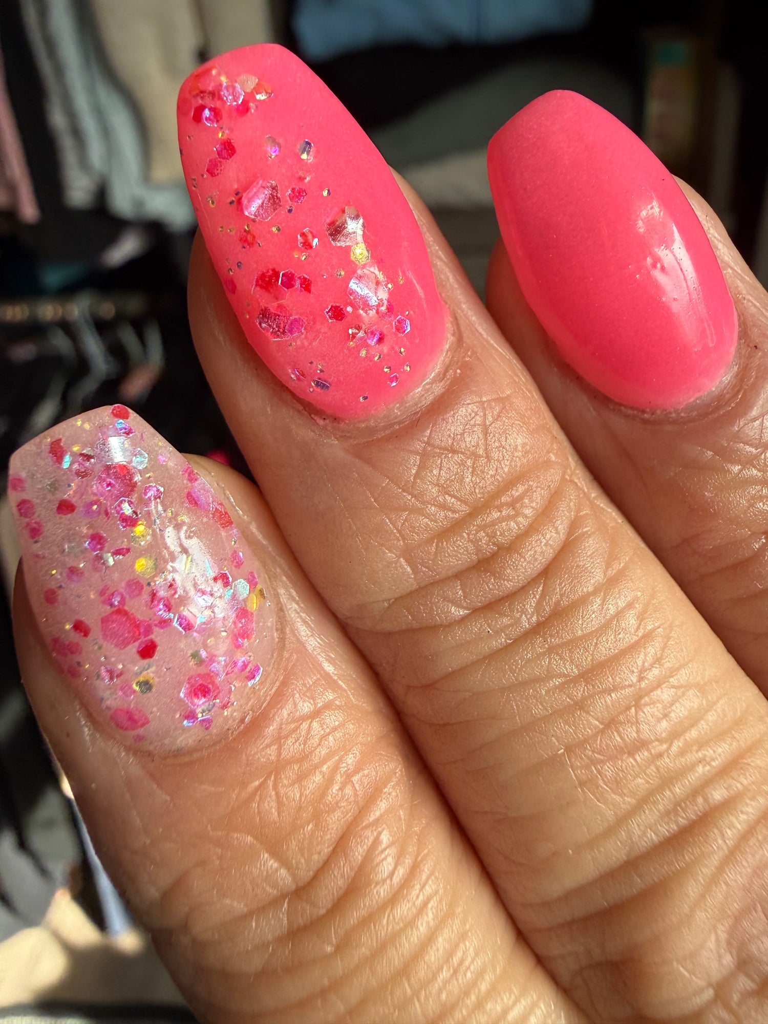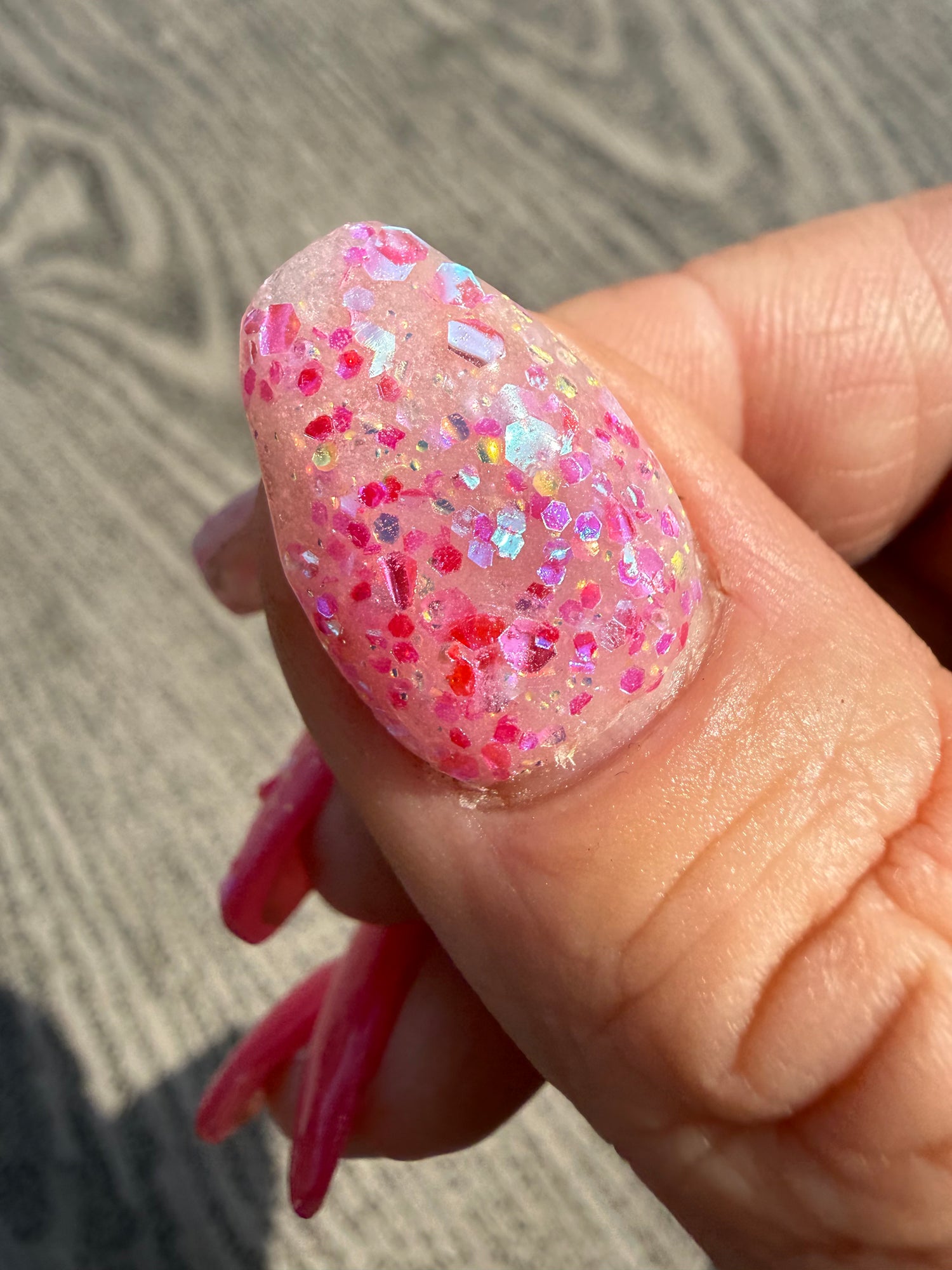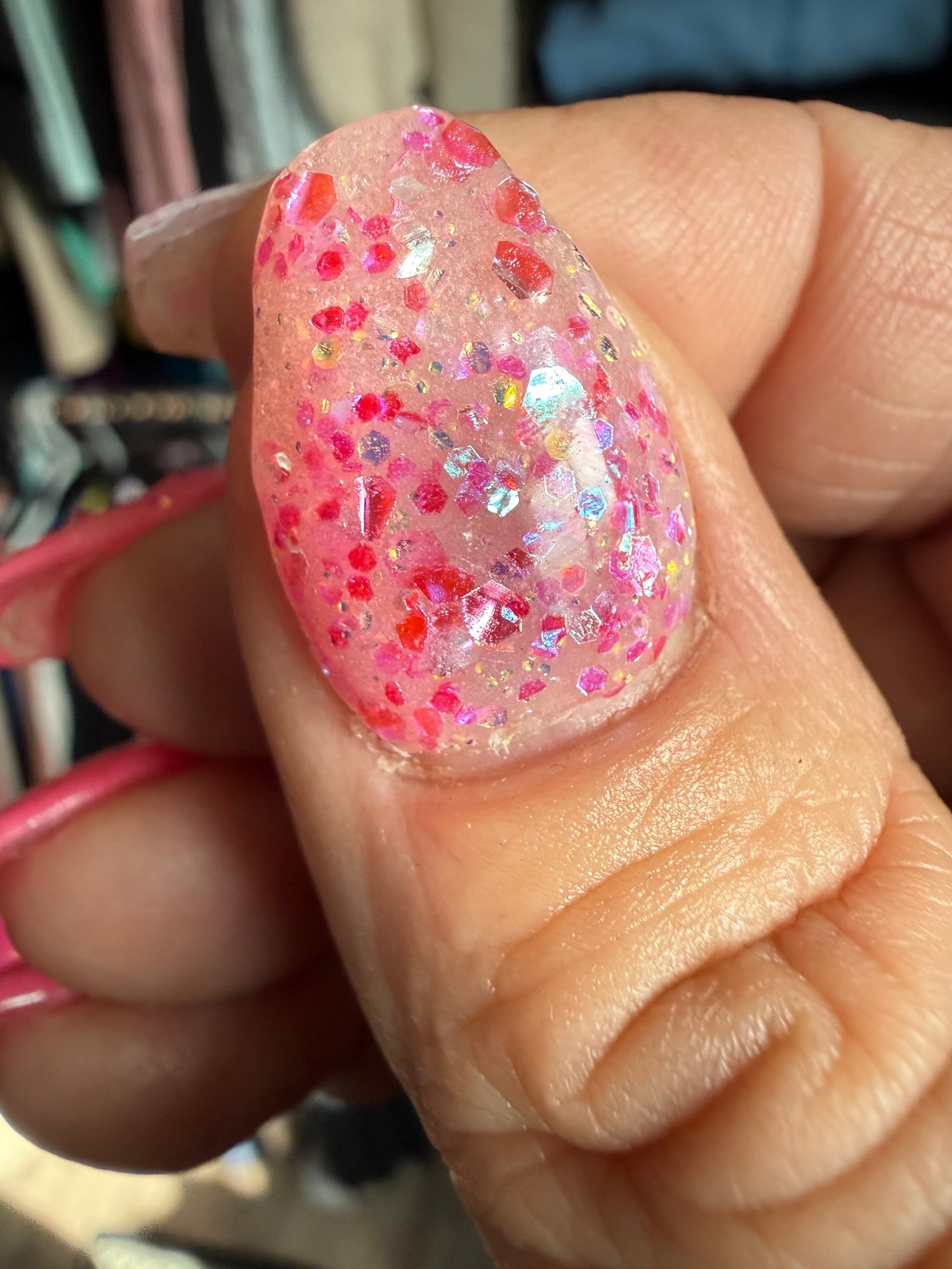 Colour: milky base with pink iridescent rhinestone glitter mix