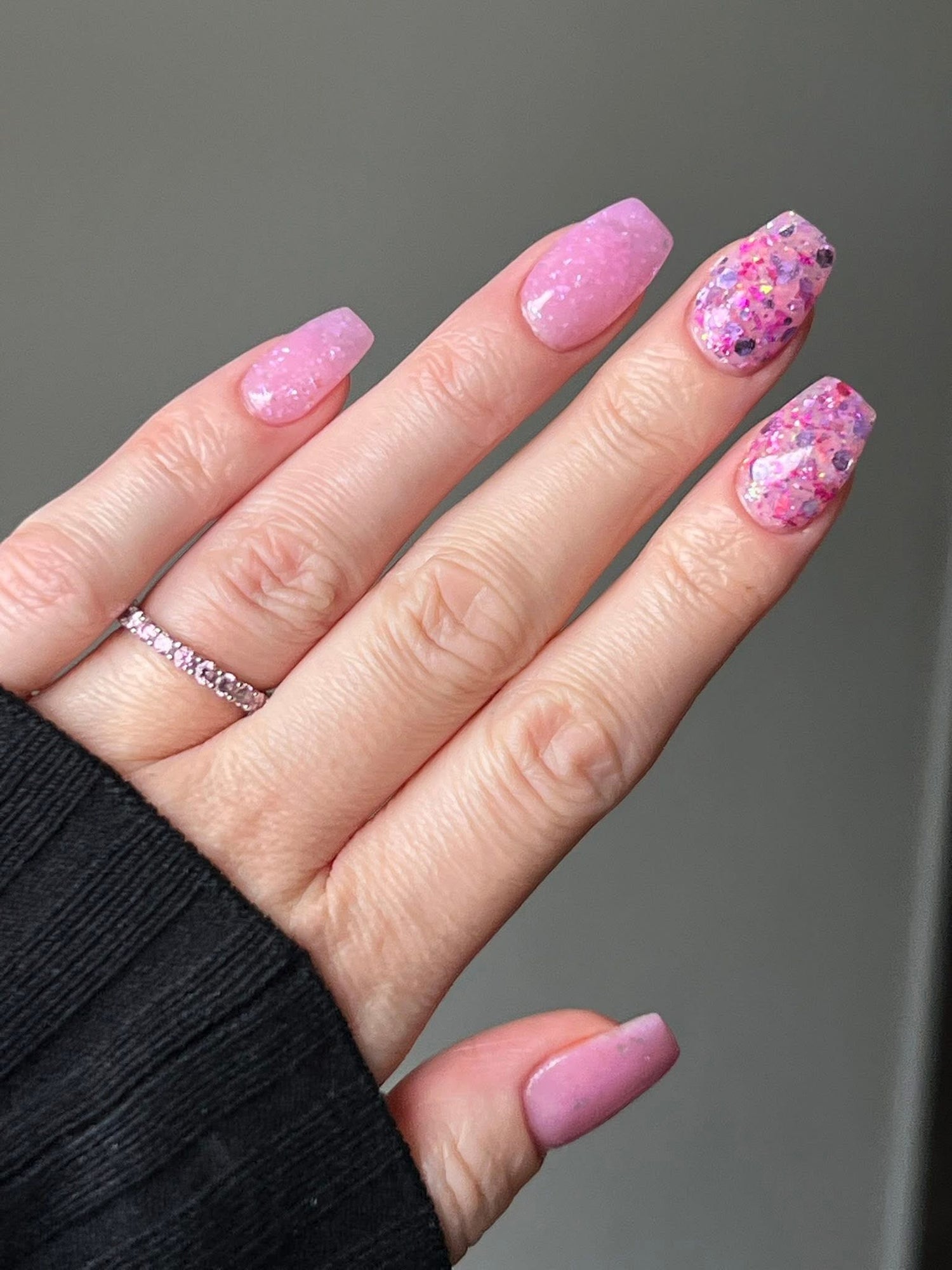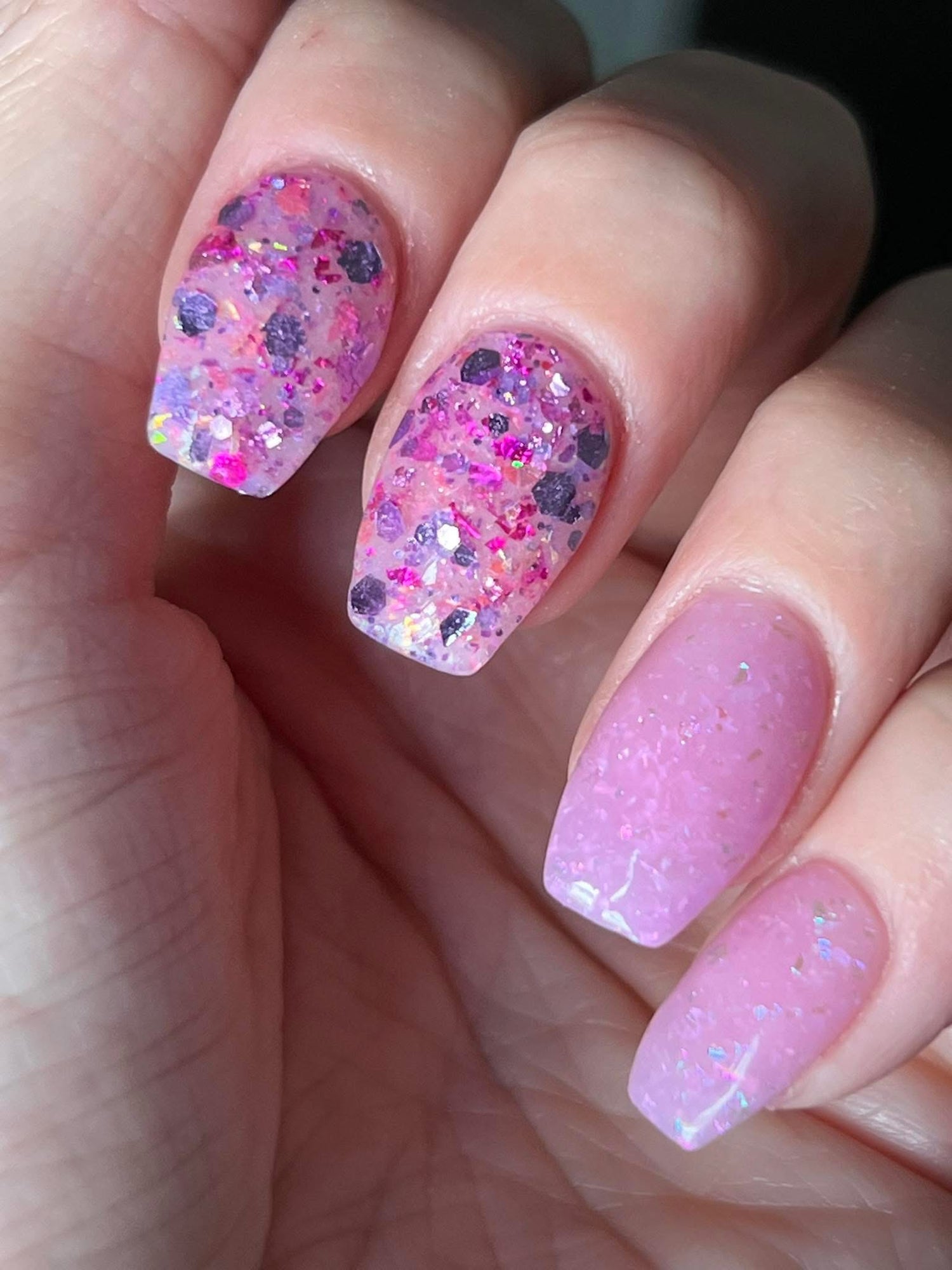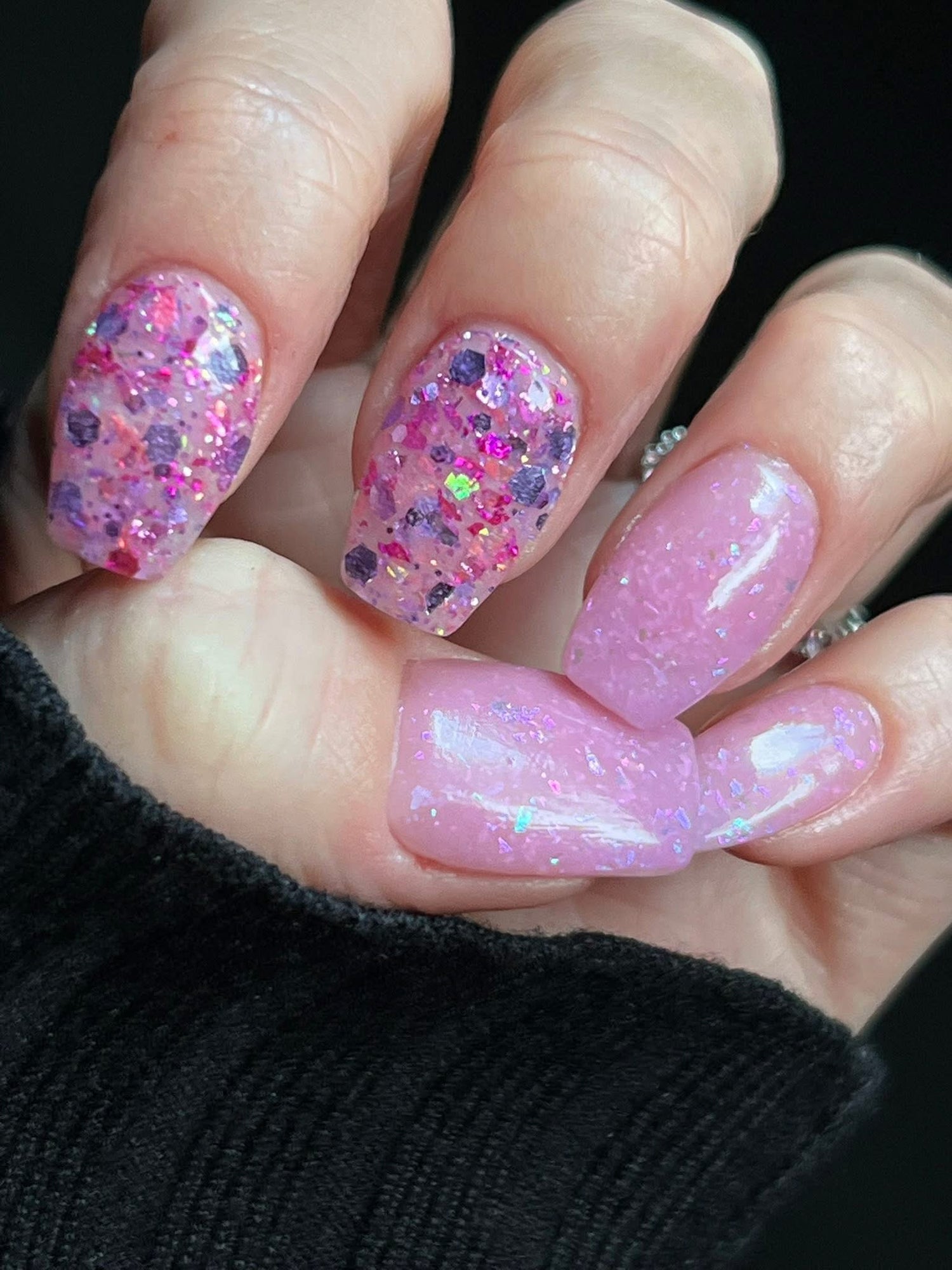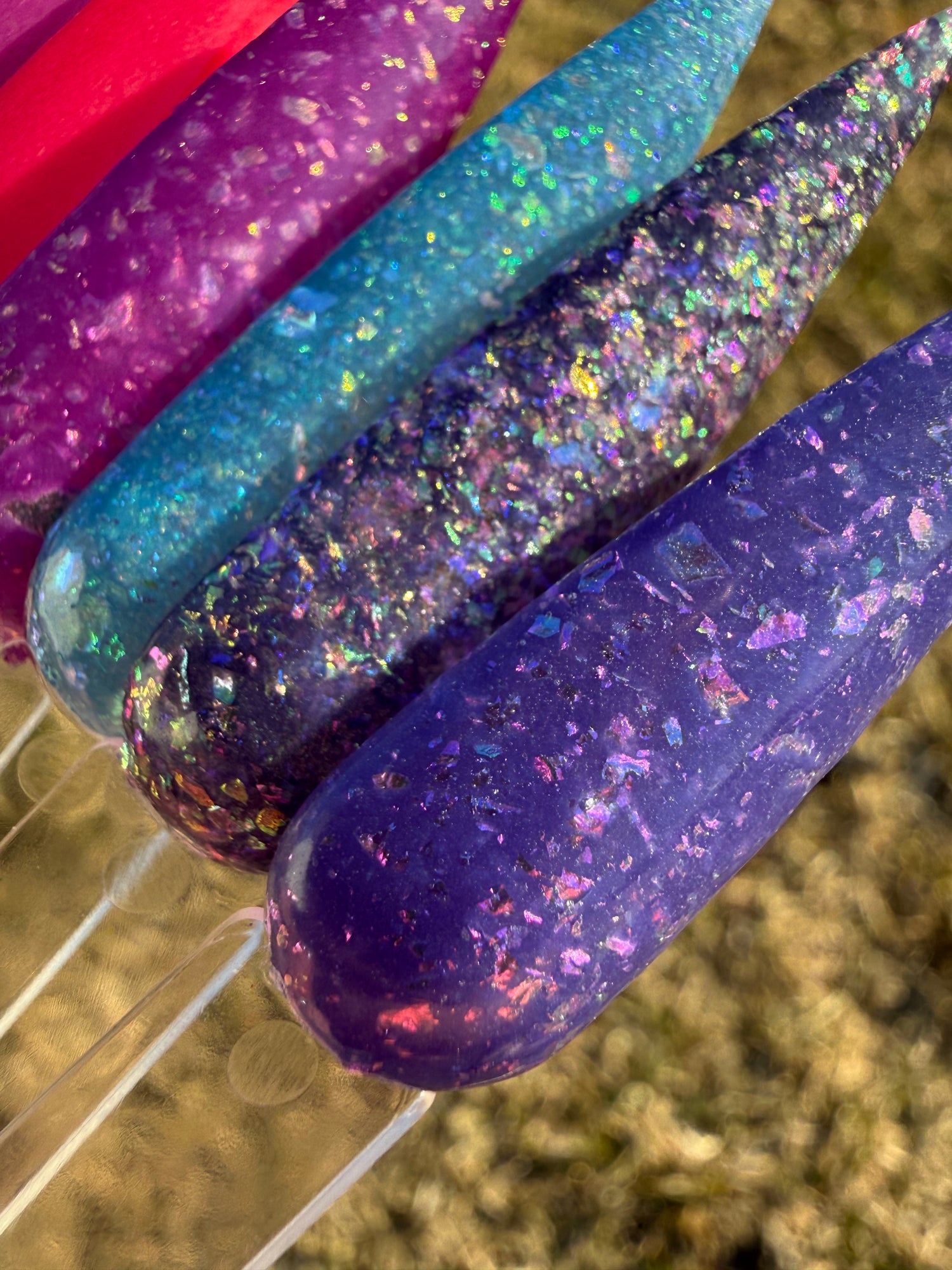 This is a delicate flake dip which is very user friendly. Topping with clear dip is strongly recommended. These swatches show 2 dips.